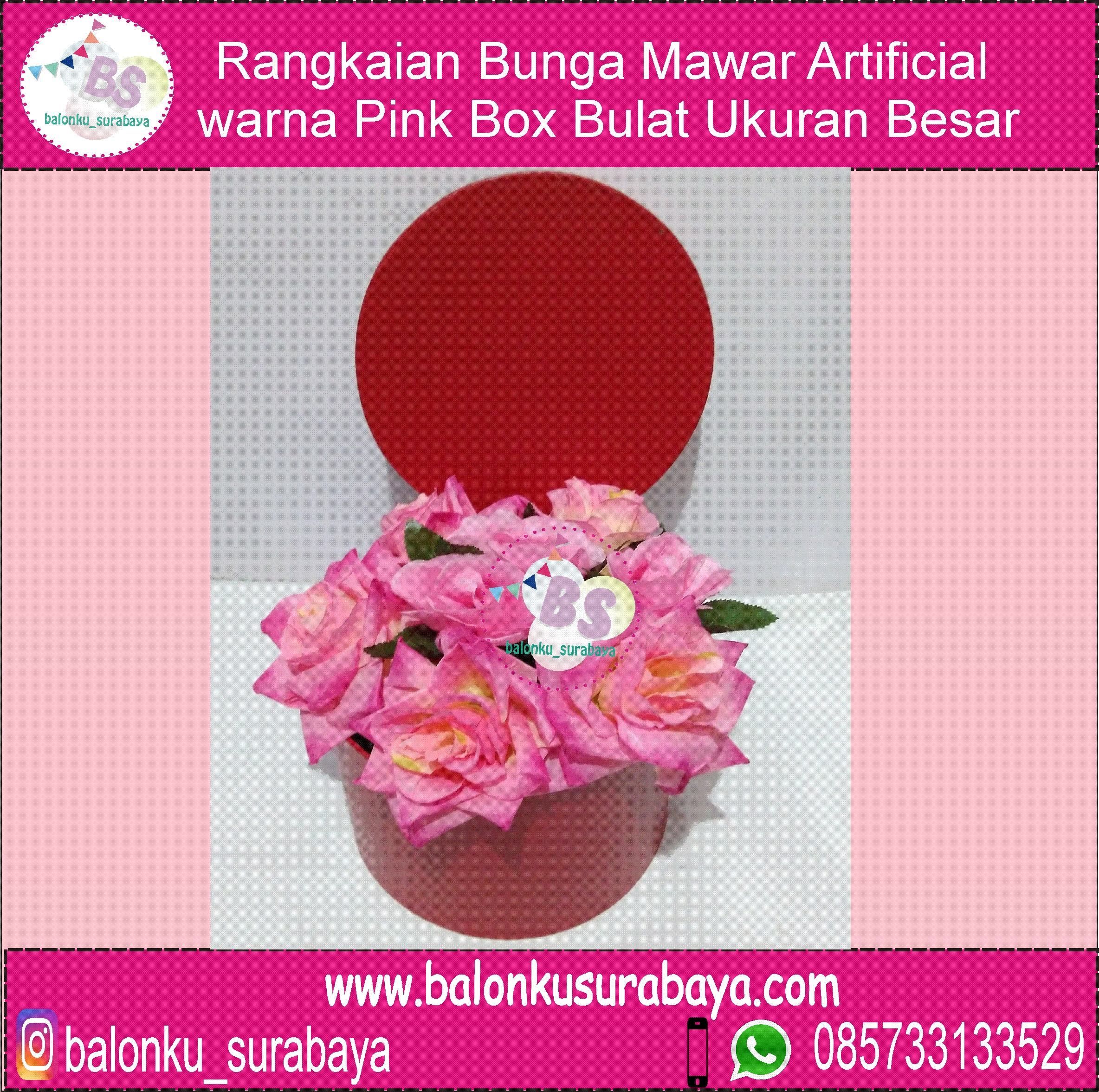 Harga Rangkaian Bunga Mawar Artificial warna Pink Box Bulat Ukuran Besar dan Balon Custom : Rp 410 .000
