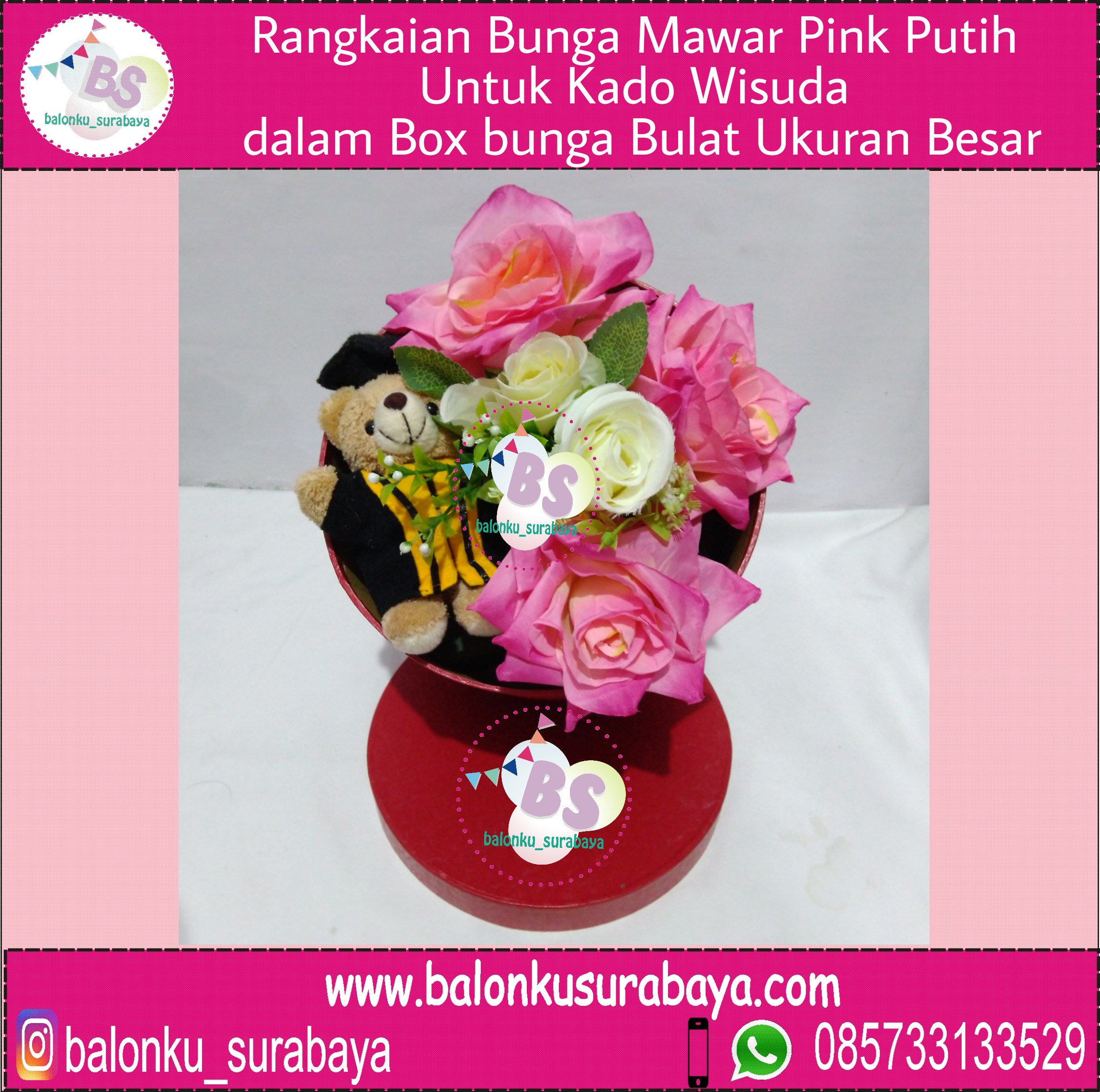 Balonku Surabaya jual Rangkaian Bunga Mawar Pink Putih Untuk Kado Wisuda dalam Box Bunga Bulat Ukuran Besar. Rangkaian bunga mawar yaitu kumpulan tangkai bunga mawar yang di hias dan dirangkai menjadi satu kesatuan buket yang indah. KAdo wisuda yaitu hadiah yang di berikan kepada orang – orang terdekat dengan tujuan memberikan ucapan selamat atas wisuda atau selesainya menempuh sidang tugas akhir. Dilengkapi dengan boneka teddy bear yang semakin memperindah Rangkaian Bunga Mawar Pink Putih Untuk Kado Wisuda dalam Box Bunga Bulat Ukuran Besar.