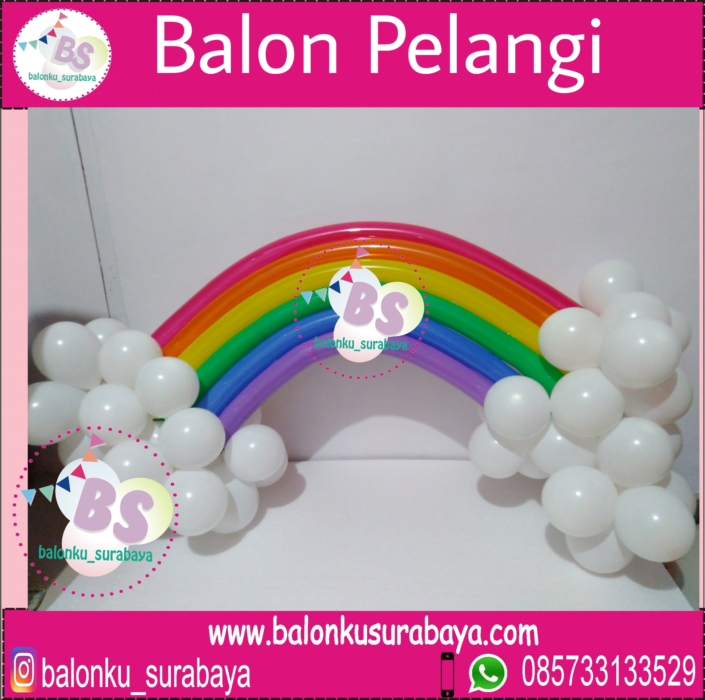 Balonku Surabaya jual Balon Pelangi yaitu rangkaian balon twist atau balon panjang diragkai sedemikian rupa da di kombinasikan denga balon latex 5 ichi untuk membentuk karakter pelangi. Balon twist yaitu balon berbahan latex atau karet yang berbentuk panjang dan mudah di bentuk – bentuk sesuai kebutuhan. Balon latex 5 inchi yaitu balon latex berukuran kecil yaitu 5 inchi untuk mempertegas karakter awan.