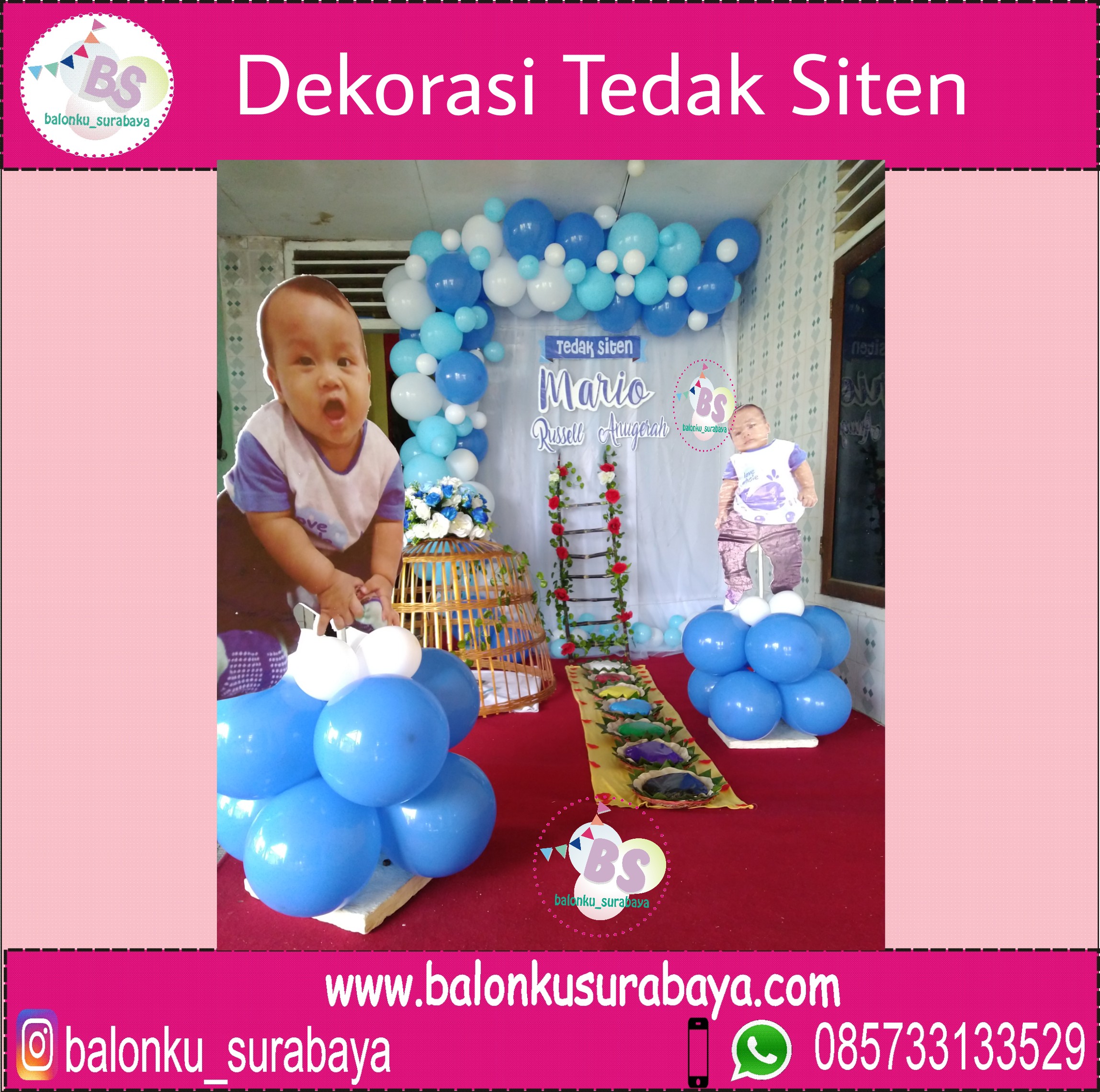 Balonku Surabaya menerima jasa Dekorasi Tedak Siten/ Mudun Lemah / Turun Tanah Tedak Siten adalah rangkaian acara atau prosesi adat jawa untuk bayi usia tujuh sampai delapan bulan dengan tradisi menginjak tetel tujuh warna, menaiki tangga tebu, dimasukkan dalam kurungan semua rangkaian tradisi tedak siten dimaksudkan agar anak menjadi pribadi yang mandiri.