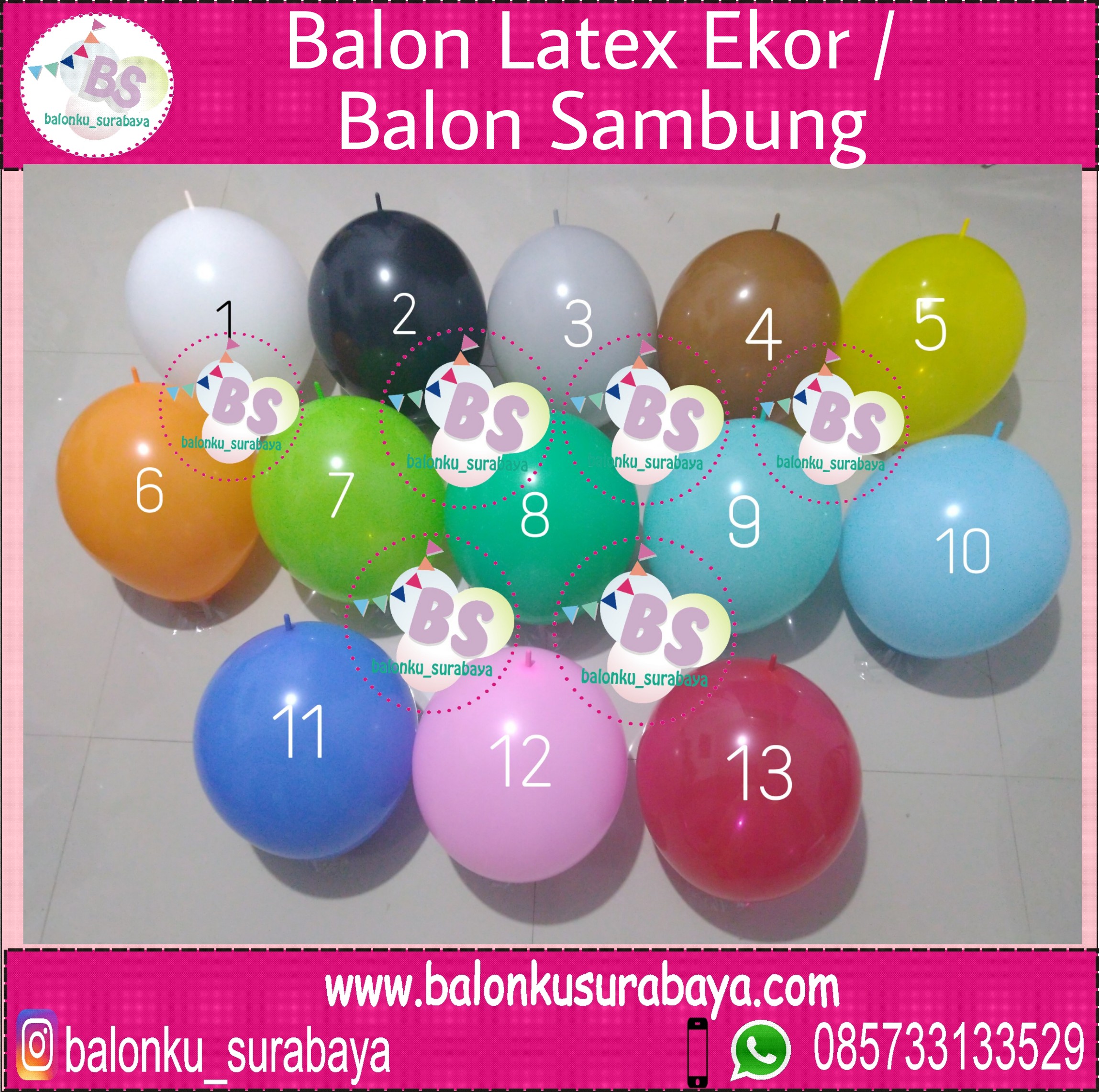 Jual balon balon latex ekor / Balon latex link / balon sambung Balonku Surabaya menjual berbagai macam balon dan perlengkapan pesta. Kami melayani pembelian langsung di toko balon kami yang terletak di keboansikep RT 04 RW 01 no 17 Gedangan Sidoarjo maupun pembelian balon secara online. Untuk pemesanan balon secara online anda dapat menghubungi kontak kami di no telp / wa 085733133529. Balonku Surabaya dapat mengirimkan pesanan ke seluruh kota di Indonesia karena lokasi kami dekat dengan ekspedisi maupun kargo.