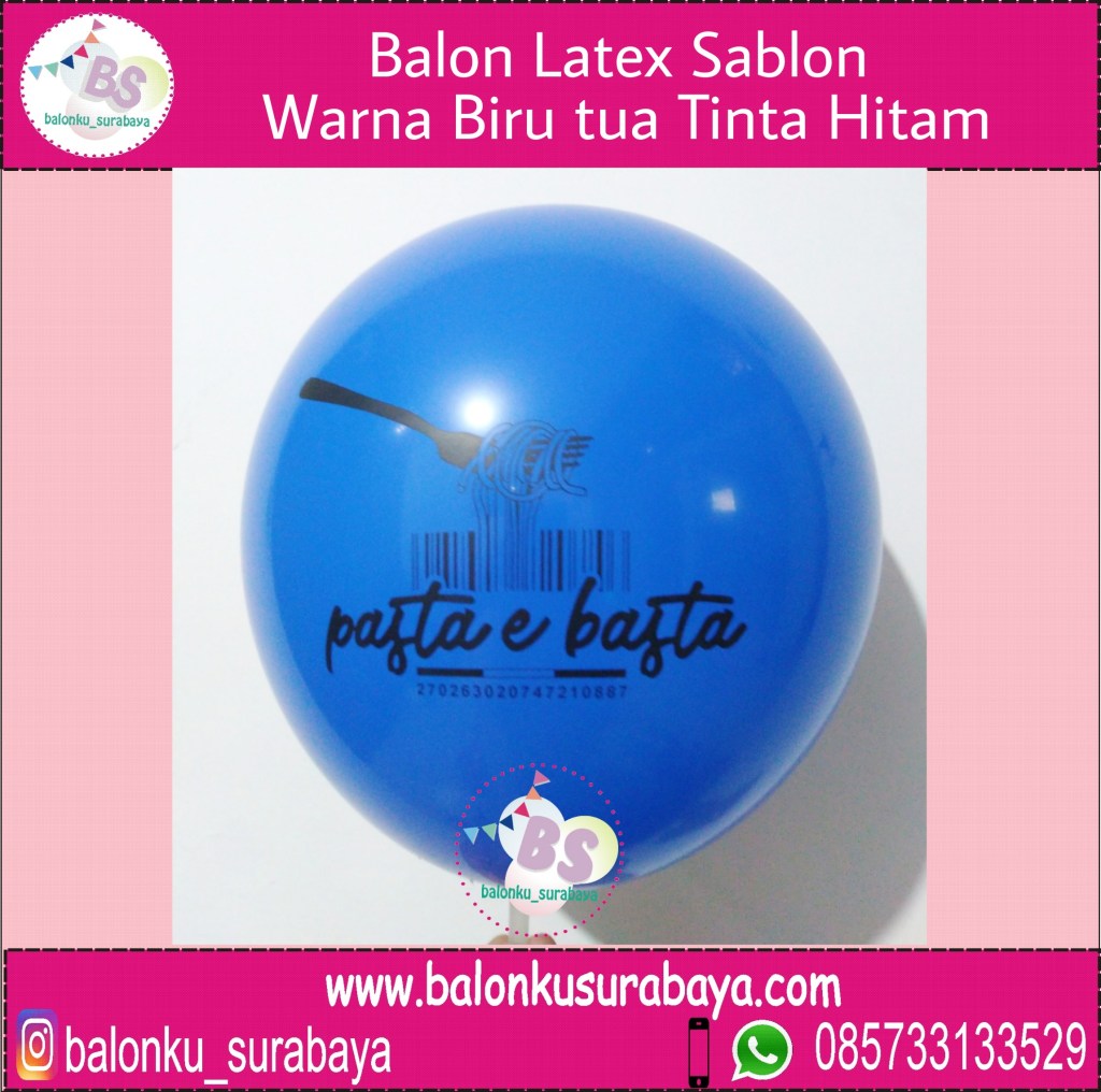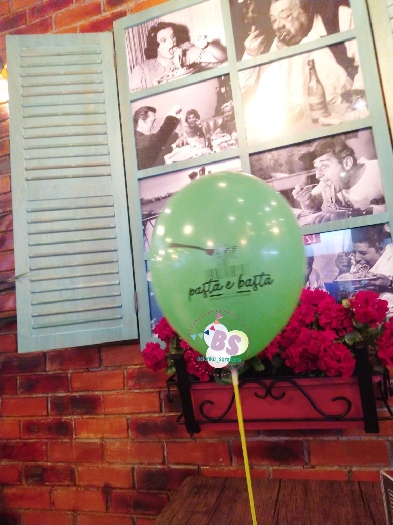 Balonku Surabaya Jual Balon Latex Sablon yaitu balon berbahan latex yang di print / di sablon dengan logo perusahaan atau nama acara tertentu sesuai dengan keinginan anda. Balonku surabaya sudah berpengalaman dalam sablon balon, kami sudah menerima pembuatan sablon balon sejak 2014 banyak kalangan yang sudah mempercayakan sablon balonnya kepada balonku surabaya seperti hisana fried chicken, nipon paint, point cafe, elyon christian school, susu tombo, cafe cangkrok, dsb. seperti gambar merupakan pesanan resto pasta e basta yang terletak di Tunjungan plaza 5 lt 5 surabaya Kami menggunakan mesin khusus Sablon balon sehingga warna tidak.pecah dan logo dapat tercetak dengan jelas.