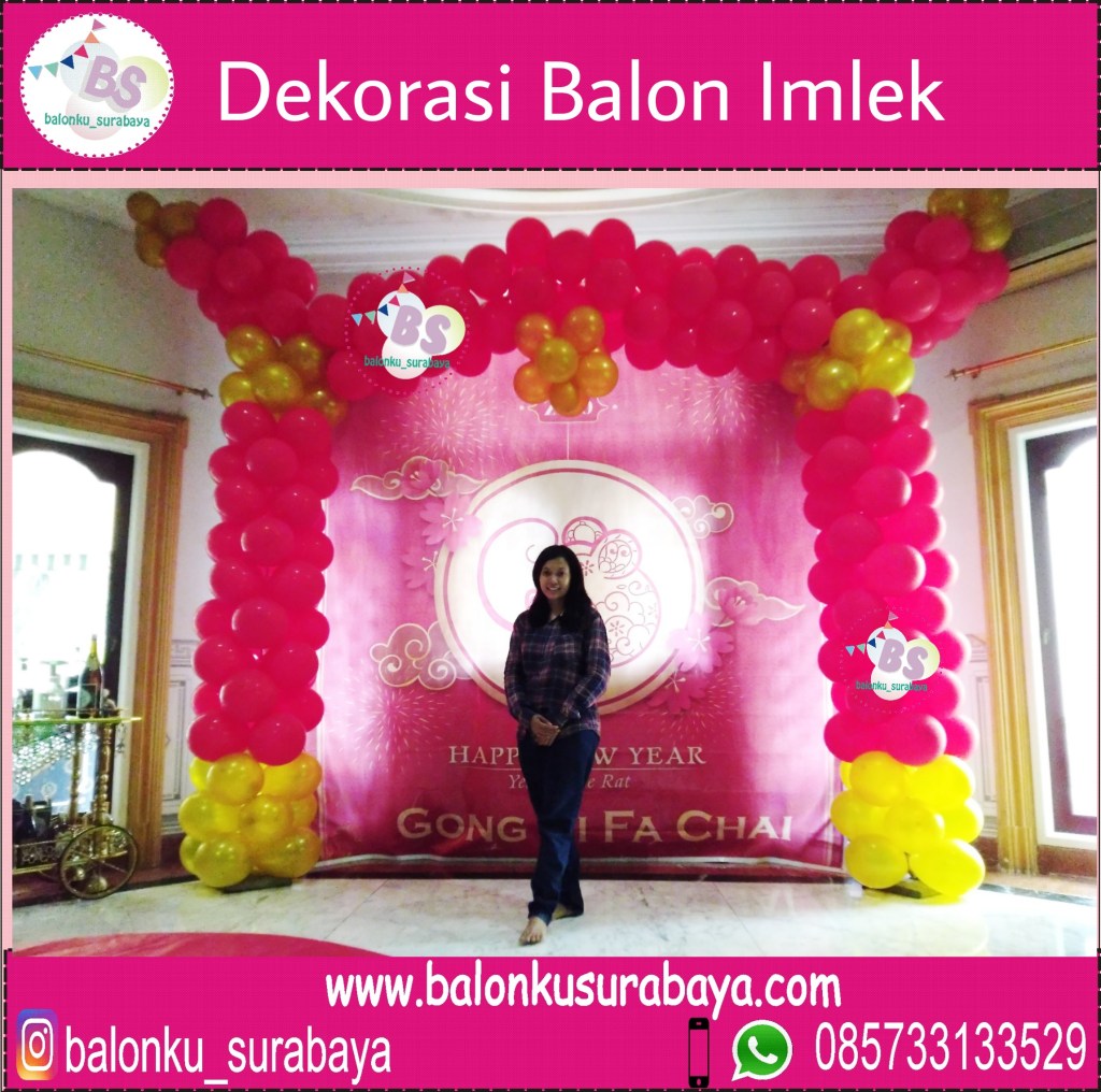 Dekorasi balon yaitu seni merangkai balon menjadi sebuah dekorasi ruangan yang indah. Kami menggunakan balon latex tebal untuk dekorasi balon kami. Dengan balon latex tebal dekorasi balon akan semakin indah. Pada dekorasi balon kali ini tema Imlek acara diadakan di Surabaya. Dekorasi balon nuansa merah dan gold. Untuk Imlek warna merah dan gold merupakan warna dominan yang sering digunakan untuk dekorasi di berbagai tempat. Dekorasi balon Imlek Surabaya kali ini digunakan untuk photo booth, tamu dan keluarga dapat berfoto di area photo booth dekorasi balon surabaya. Untuk Ruangan besar kami menggunakan dekorasi balon gapura ukuran besar 3 x 3 meter. Pada dekorasi balon Imlek kami menggunakan balon latex warna merah dan balon metalik warna gold dipadukan dengan banner. Pada bagian ruangan yang lain kami berikan dekorasi balon Imlek dengan bentuk bunga di setiap ruangan.