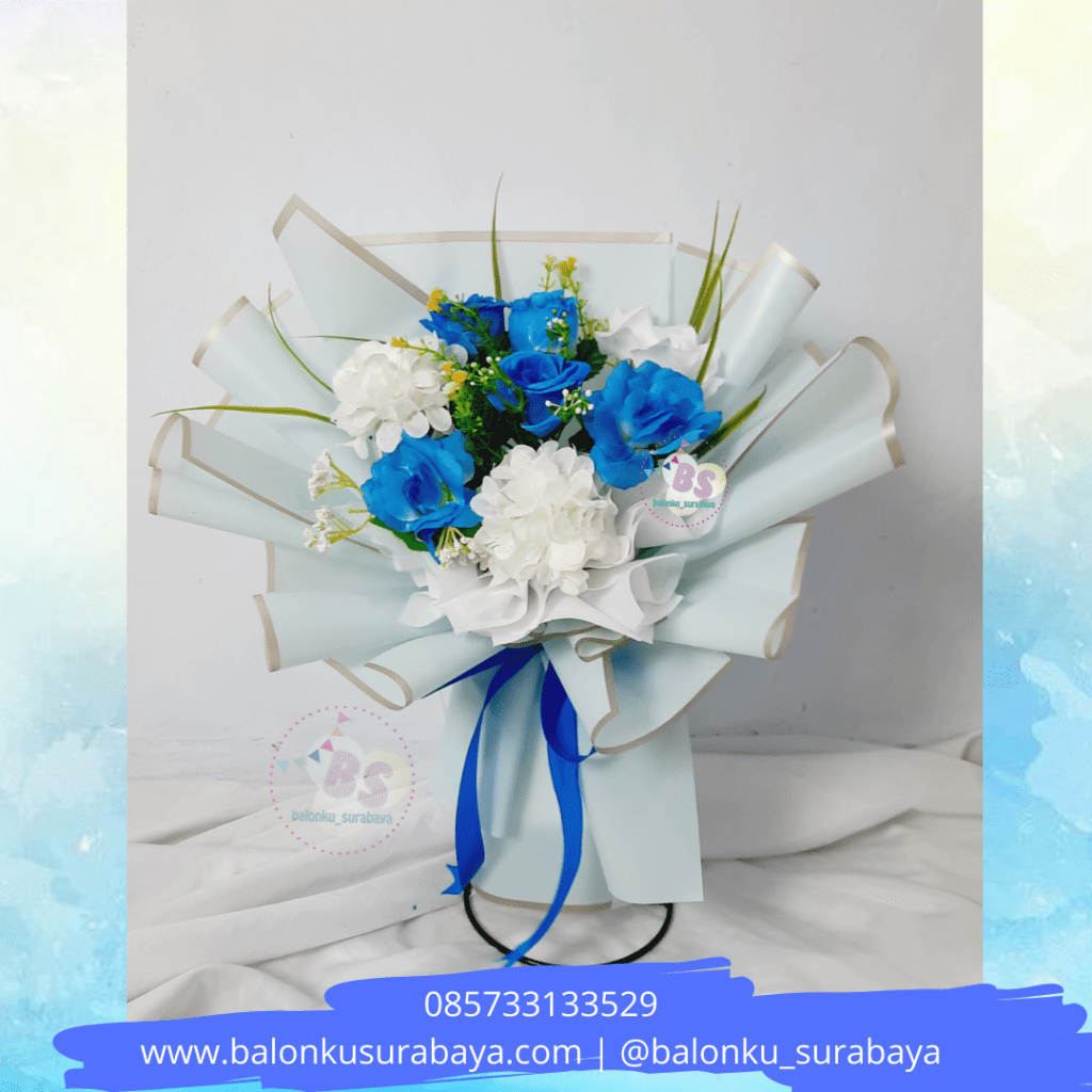 Balonku surabaya menyediakan hand bouquet dari bunga plastik dengan berbagai macam ukuran. Seperti contoh merupakan hand bouquet ukuran medium yang berisikan bunga berwarna biru dan putih. Untuk pemesanan hand bouquet dapat melalui wa kami di 08573333529. Atau anda dapat mengambil hand bouquet di toko kami yang beralamatkan di keboan sikep rt4 RW 1 no 17 Gedangan sidoarjo