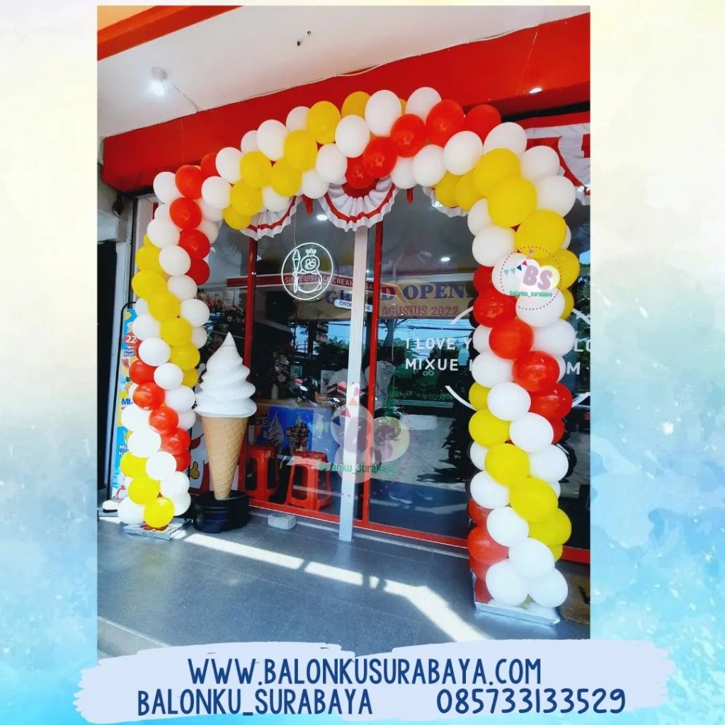 Pada kesempatan kali ini balonku surabaya membuat balon gapura untuk pembukaan toko mixue ice cream and tea. Balonku surabaya membuat balom gapura dengan tema warna merah, putih dan kuning. Warna balon dapat di sesuaikan dengan tema warna logo atau tema acara